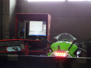 僕のZX-10Rは東南アジア仕様だけど既にECU書換によりいわゆる“フルパワー化”済。今回は、ZX-10RのエアクリーナーをBMCのレーシングタイプ(要燃調セッティング)に交換したのに合わせて実車合わせでECUのリセッティングをしてもらうことにしました。再度、MotoJPさんへ施工をお願いしました。シャシダイはNAP'S幸浦のFUCHSテストベンチを使わせてもらいながら、リセッティングです。